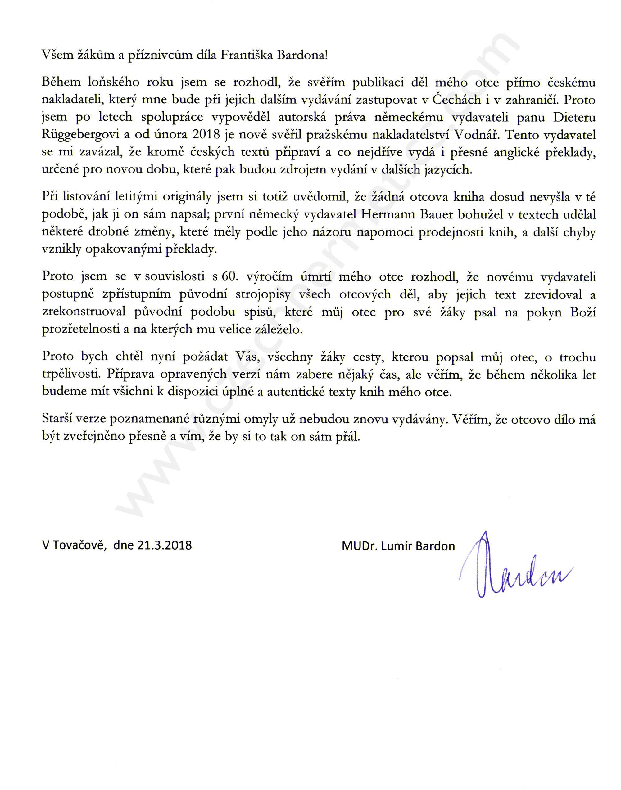 s výslovným svolením sem kopíruji velmi důležitý otevřený dopis pana dr. Lumíra Bardona. Jak uvidíte, zájem veřejnosti o dílo jeho otce ho těší natolik, že k šedesátiletému úmrtí Františka Bardona, které připadá na letošní rok, poskytne k vydání původní originály děl svého otce, které dosud neměl nikdo k dispozici.