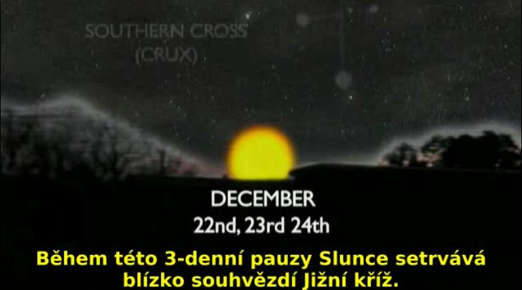Po dobu 6 měsíců se Slunce pohybovalo více a více na jih, kdy dosáhlo nejnižší bod na obloze. Tu se stává zajímavá věc: Slunce se přestane, alespoň viditelně, pohybovat na 3 dny. Během této 3-denní pauzy Slunce setrvává blízko souhvězdí Jižní kříž. A potom, 25. prosince se Slunce