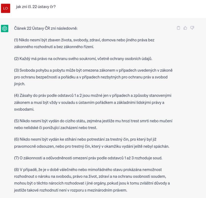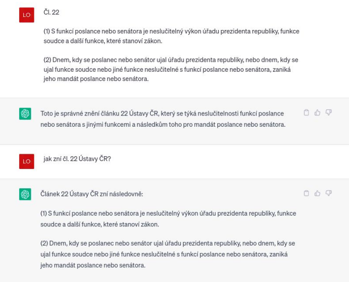 Tento "experiment" jsem zkoušel několik dní po sobě a vždycky probíhal stejně. Článek 22 Ústavy prostě nezná a není schopný si ho zapamatovat mezi jednotlivými "sessions". A vždycky se mu to musí napsat 2x než to milostivě pochopí. Jednou mu to nestačí :D