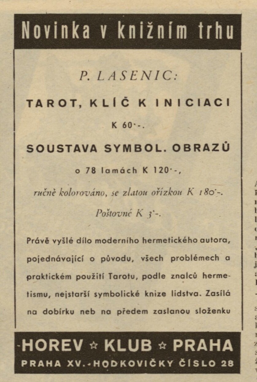 Pro zajímavost dobový inzerát na Horevský tarot.