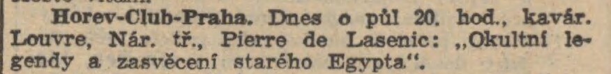 Dobová pozvánka v inzerátu na přednášku Lasenica v Horevu ze dne 5.4.1938.
