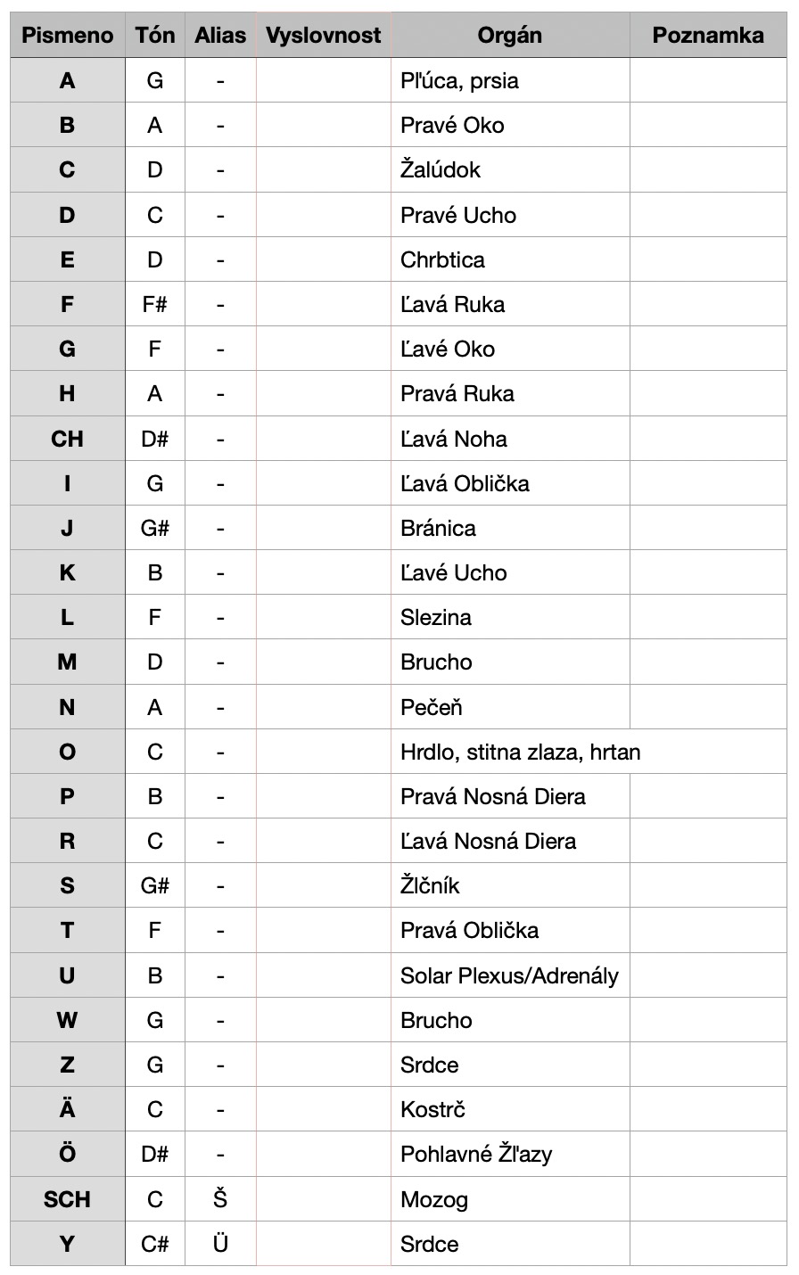 Zdravim, chcel by som poprosit ci by sme neskompletizovali zakladne pisemena. Nakolko su tam nejake nezrovnalosti ohladom umiestnenia do organov, tiez vyslovnost by bolo velmi dobre dopisat. Ak by ste niekto mal tieto vedmosti prosim napiste do tohoto vlakna, podoplnujem to vsetko do tej tabulky a aktualizujem ju nech to mame tie pismenka poopravovane.