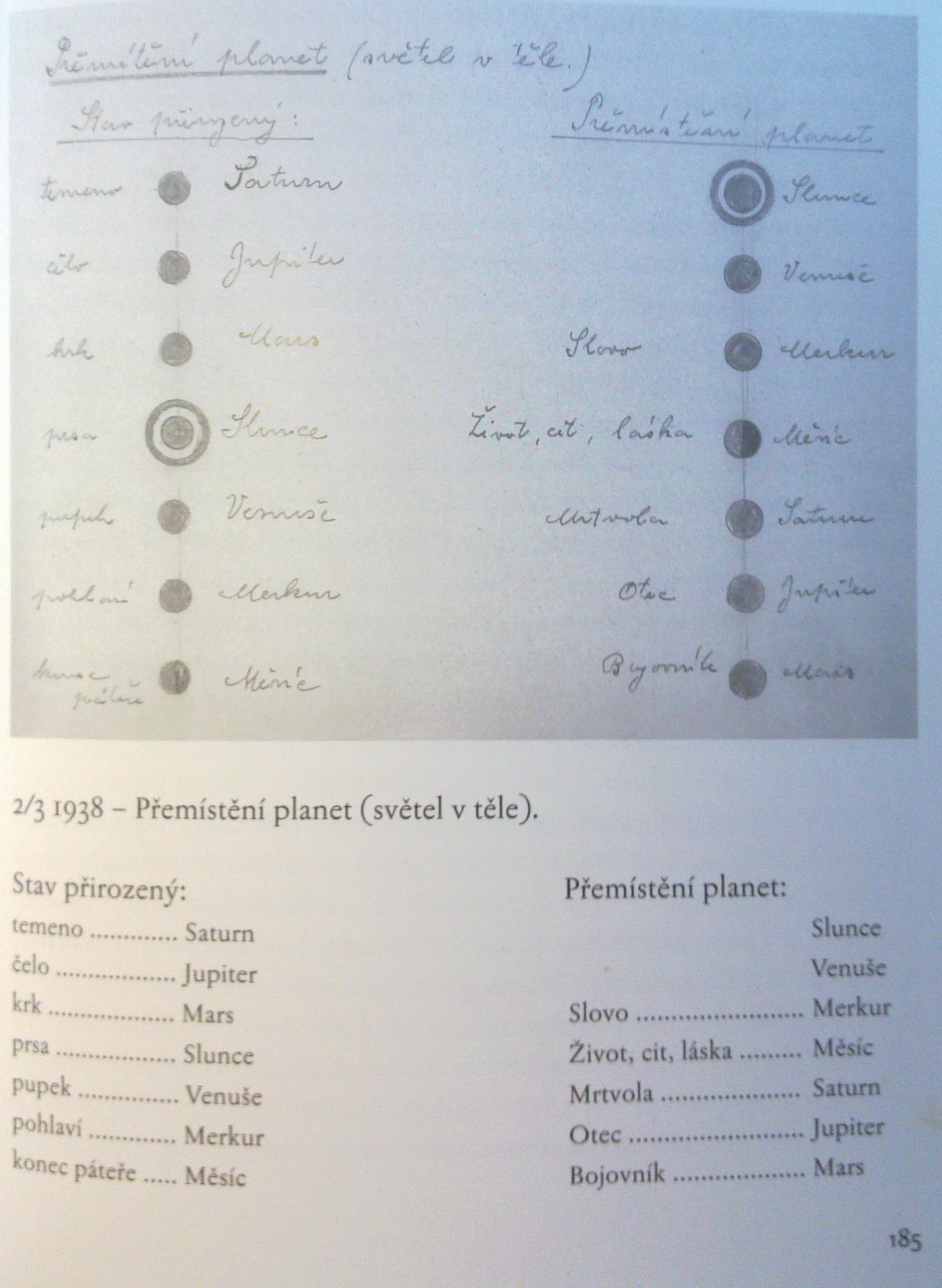 Co se týče přemístění planet při evoluci neboli stoupání. Tak podle Drtikolova obrázku se čtyři spodní čakry „vyšplhají“ po třech vyšších, ale jinak pořadí předešlé horní trojice a spodní čtveřice zůstává stejné. Pořadí od nejnižšího je tedy: Mars, Jupiter, Saturn, Luna, Merkur, Venuše, Slunce. Odspodu jsou ještě vypsány důsledky tohoto přemístění jako: Bojovník, Otec, Mrtvola, Život/Cit/Láska, Slovo – horní dvě centra zůstávají nepopsána.