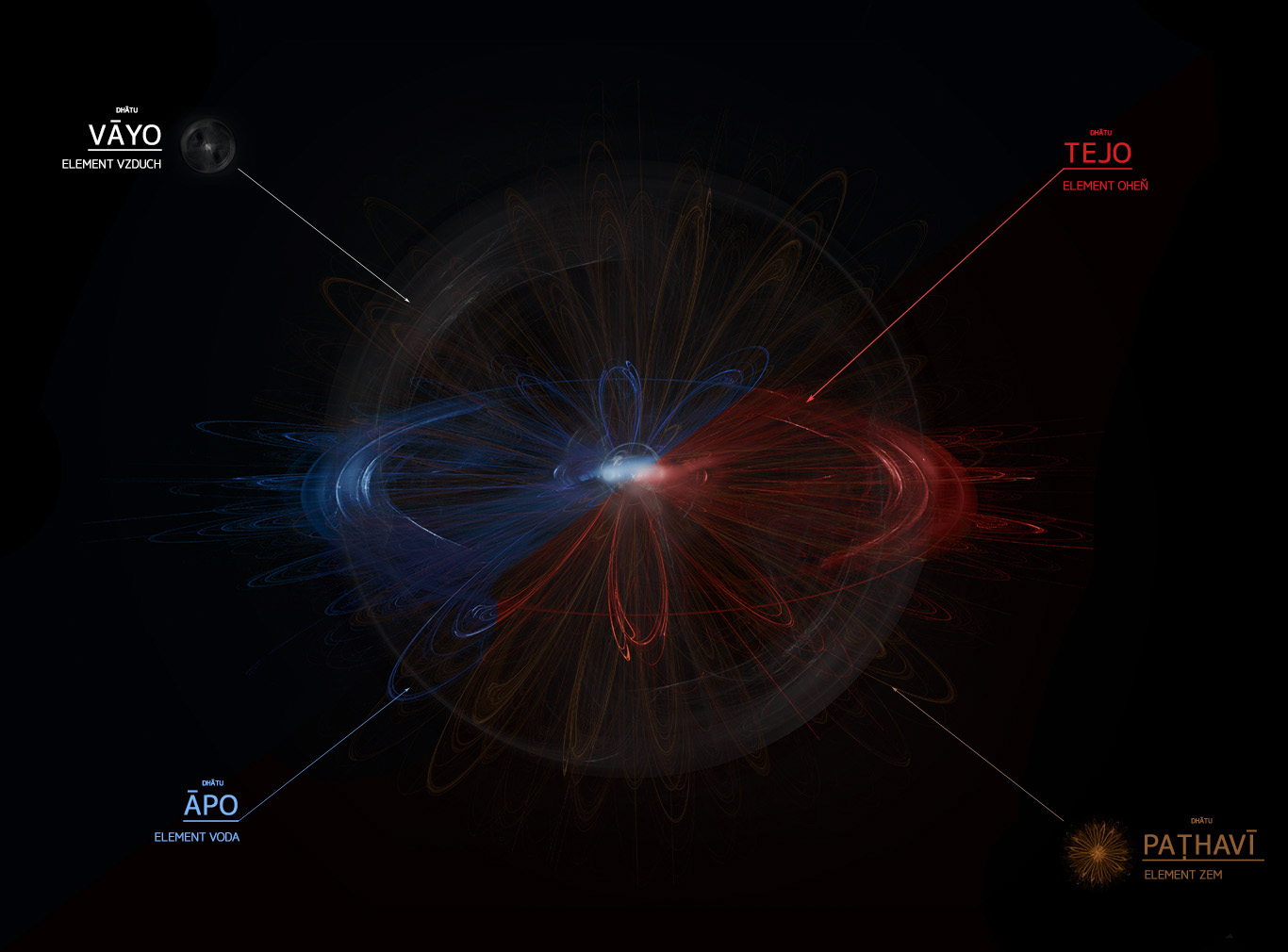 esteticky a umělecky to vypadá krásně, jako jádro atomu. Ale na porozumění je to hodně nejasné, mlhavé čáry ve tmě :-) určitě bych přidal na sytosti barev - vzduch a země jsou skoro nezřetelné.