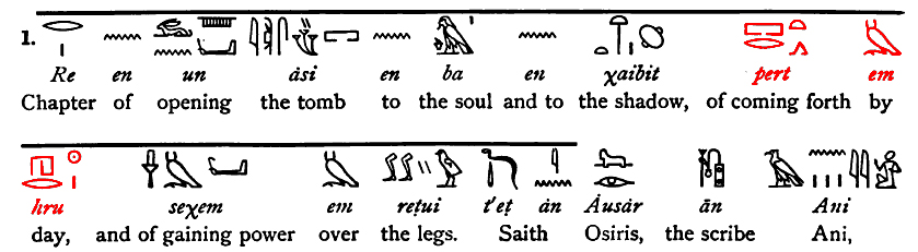 Pokud to bude k něčemu dobré, do přílohy dávám Peret em heru v hieroglyfech jako přímou citaci z Knihy mrtvých: