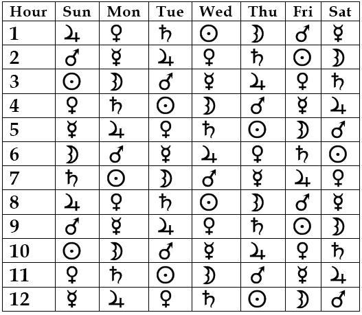 Jak vidíte, pořadí planetárních hodin je shodné s klasickou chaldejskou řadou Luna-Merkur-Venuše-Slunce-Mars-Jupiter-Saturn.