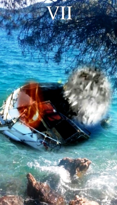 Živlová bytost vody se vznáší v meditaci nad zemí a vodami, nesena k věčnosti vzduchem na ohnivém koberci a ozářena zapadajícím sluncem.