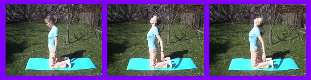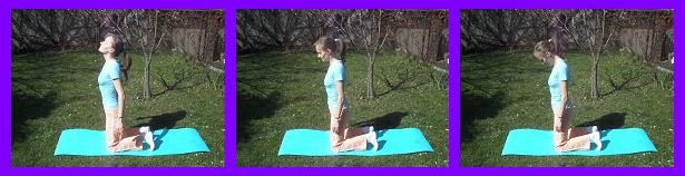 Klečíme na podlaze s napřímeným tělem, prsty u nohou se opíráme o podložku. Ruce volně spuštěné k zemi. Před zahájením cviku předkloníme hlavu, zatlačíme bradu na hruď a vydechneme.