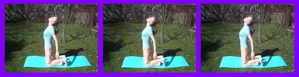 Po celou dobu cviku pas zůstává pevný, neprohýbáme se tedy v bedrech, ani nezakláníme celý trup i s nohama dozadu. Začneme prohýbat dozadu pouze páteř a horní část trupu od pasu nahoru, současně zakláníme hlavu a nadechujeme se. Pomocí rukou, které tlačíme dozadu, ještě více zdůrazníme vypnutí hrudi. Optimální doba trvání je opět 3 vteřiny.