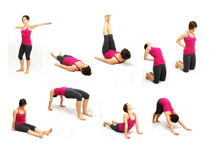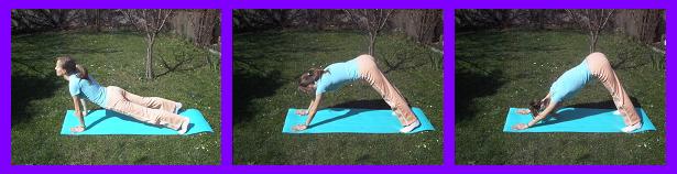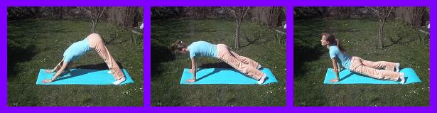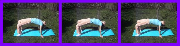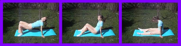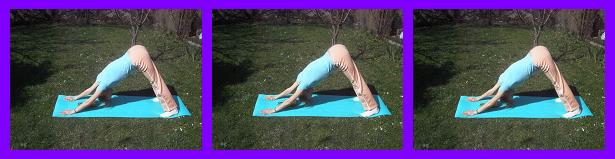 Začneme pomalu vydechovat, spouštíme pánev směrem k zemi, hlavu začneme předklánět a vracíme se postupně zpět do výchozí pozice. Kdy zůstáváme opřeni o ruce, trup necháme volně prověšený dolů, hlava je zakloněna a dokončili jsme výdech. Opět trvání tři vteřiny. A poté následuje další opakování stejného cviku až do stanoveného počtu opakování. Pak teprve přejdeme k následujícímu cviku. Pokud je někdo při cviku příliš zadýchává, opět doporučujeme po každém jednotlivém cviku vložit ve výchozí poloze jeden volný nádech a výdech navíc.