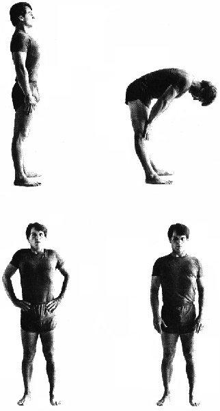 Postavte se zpříma a zhluboka vydechněte. Přitom se předkloňte dopředu a opřete se rukama o kolena. Vytlačte z plic poslední zbytek vzduchu a vraťte se do předchozího vzpřímeného postoje. Dejte ruce v bok a zakloňte se. Tím se vám narovnají záda. Vtáhněte přitom břicho co možná nejvíc dovnitř a hrudník zvedejte vzhůru.