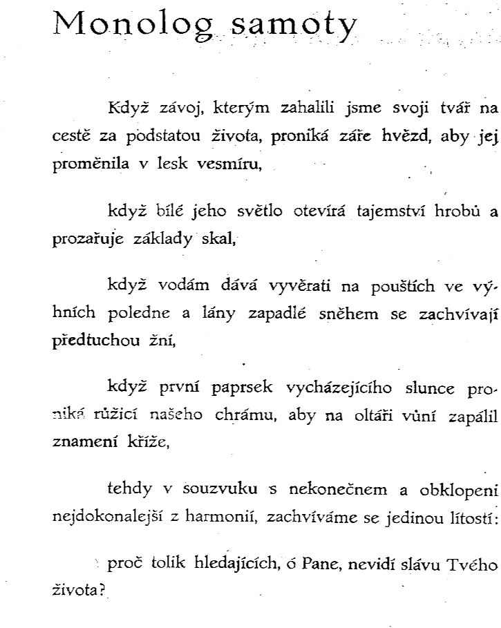 Otče, Ty víš, že ten, jenž toto mluví, mnoho bojoval a mnoho trpěl; zažil chudobu, pomluvy, pohrdání, žalář, všichni, které miloval ho opustili. Přes to však nikdy nebyl nešťasten, poněvadž útěchou mu byla pravda a spravedlnost. Ty jediný Jsi svatý, Bože opravdových srdcí a spravedlivých duší a Ty víš, že nikdy jsem se nepokládal bez chyb před tváří Tvou. Tak jako všichni lidé byl jsem hračkou lidských vášní, pak jsem je - lépe však: pak Ty jsi je ve mně překonal, - a dal Jsi mi, abych odpočinul v hlubokém míru těch, kteří hledají a touží jenom po Tobě.