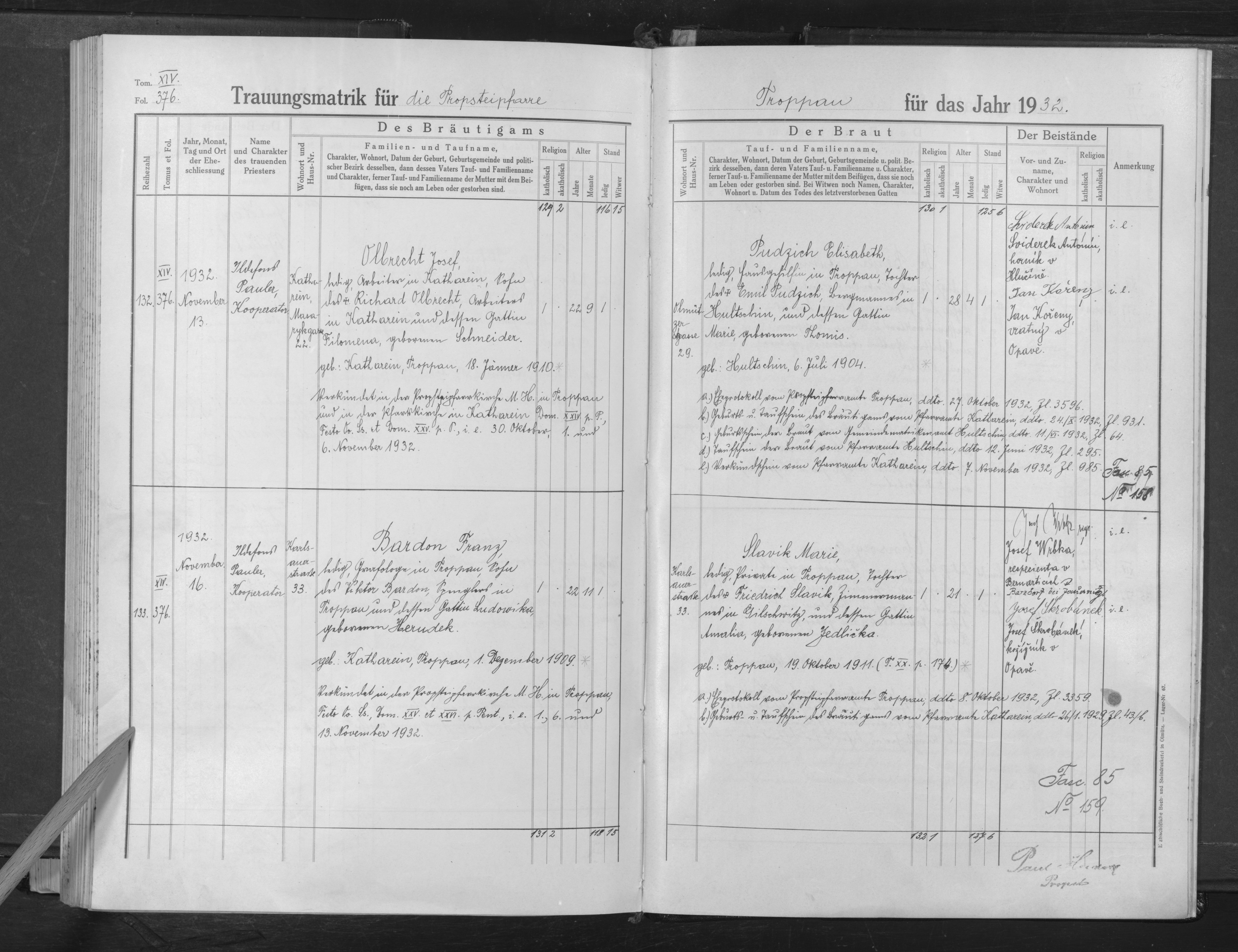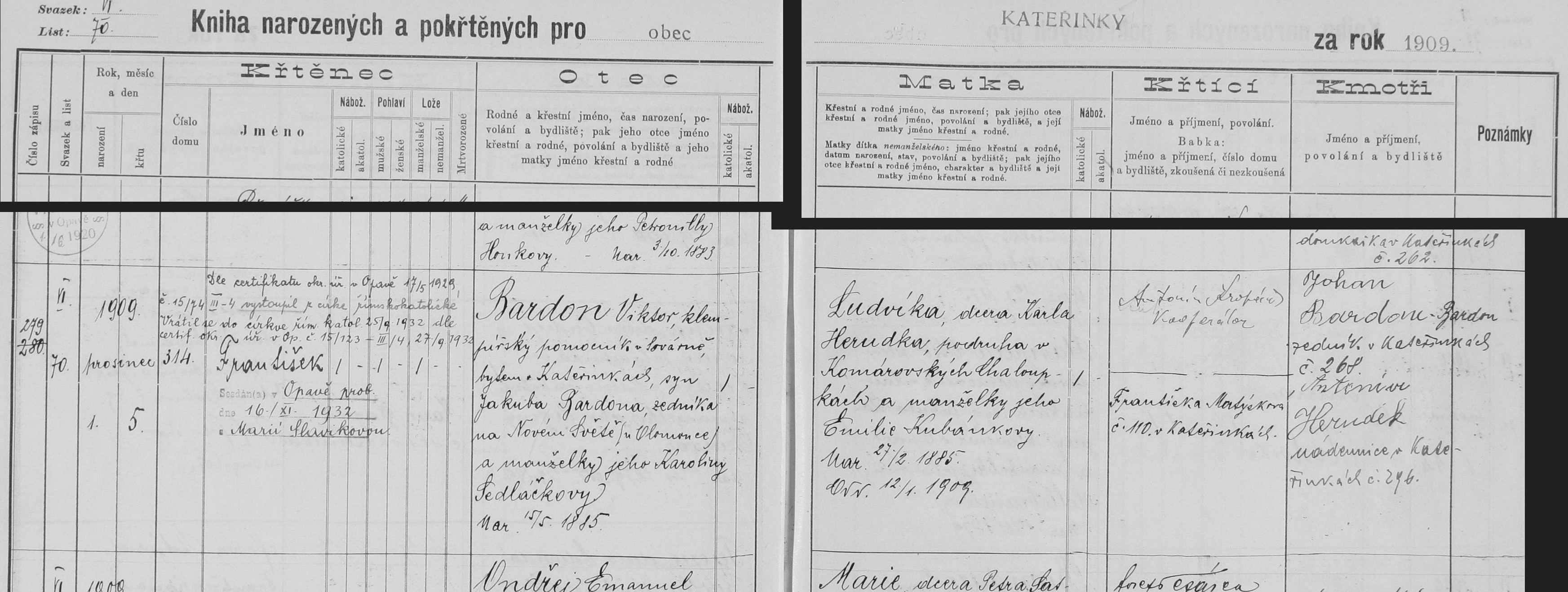 Poslední dny se pracovně probírám nějakými digitalizovanými matrikami tak mě napadlo podívat se po záznamech mistrova příchodu ... a ono ejhle ... je to krásně přístupné a dohledatelné. Tedy pro zajímavost nahrávám - zejména záznam z knihy narozených prozrazuje pár zajímavých drobností - Františkovi rodiče, Viktor a Ludvíka, byli stejný ročník (1885), vzali se v necelých 24 letech (12. 1. 1909) a synka v lásce počali asi o šest týdnů později - na přelomu února a března. František se narodil v Kateřinkách v domě č. 314, na svět mu pomohla porodní bába Františka Matýsková, pokřtěn byl co čtyřdenní novorozenec a za kmotry mu šli strýc Johan (zřejmě bratr otce) a teta Tonka (zřejmě sestra maminky). Je zde přesně uvedeno datum vystoupení (17. 5. 1929) z ř-k. církve a návrat zpět (25. 9. 1932), který - krom jiného - mohl mít i ten praktický důvod, aby mohli mít s manželkou Marií o necelé dva měsíce později řádný církevní sňatek. Svatba byla 16. listopadu roku 1932, Františkovi šel za svědka pan Josef Wrbka - pracovník finanční stráže z 80 km vzdálených Bernartic, zřejmě přítel? Jako tehdejší bydliště mají oba manželé uvedenu Karlsauerstrasse č. 33. Toť trocha šafránu z Opavského archivu...