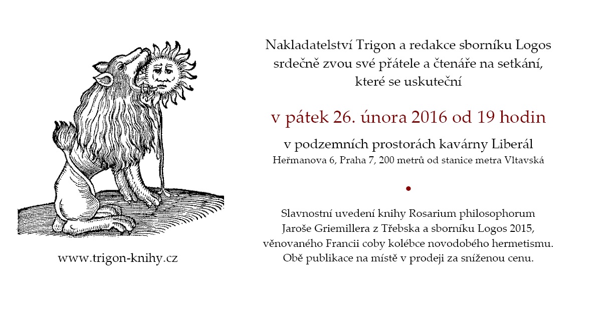 nakladatelství Trigon pořádá v pátek 26. 2. 2016 od 19 hodin tradiční večer Logosu (viewtopic.php?f=4&t=1588), spojený tentokrát se křtem významné české alchymie Rosarium philosophorum. viewtopic.php?f=4&t=1582