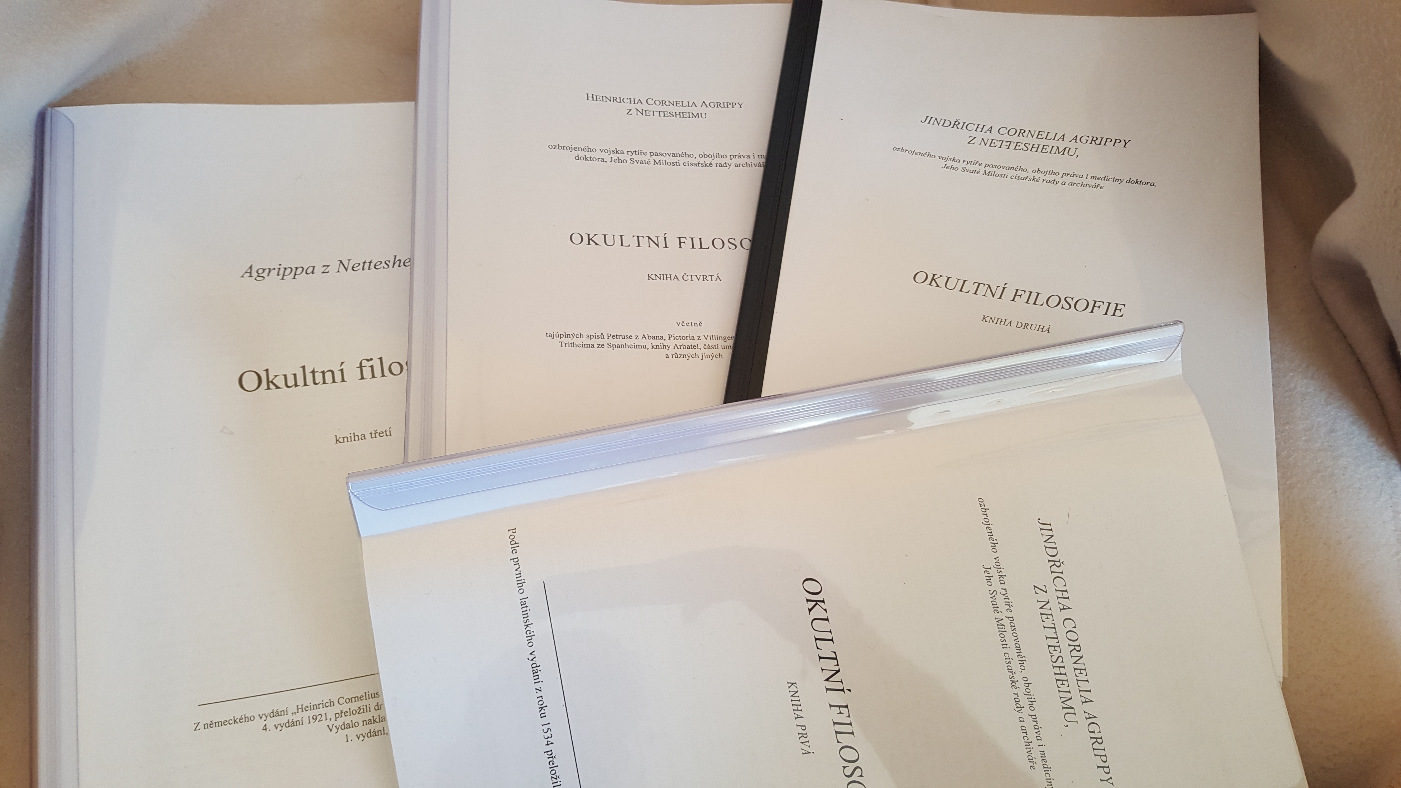 Agrippovu okultní filozofii věnuji - mám přebytečné - díly 1 a 2 jsou ofocené a svazáné prvorepublikové vydání, vpisky, odřené desky některé listy se uvolňují, díly 3-5 je straší vydání od Trigonu, celkem slušný stav.