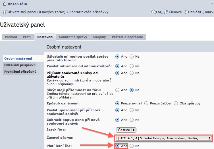 Kdyby se Vám někomu špatně zobrazovali časy, tak si prosím v uživatelských panelech zvolte správně časovou zonu a povolte letní čas. Viz obrázek.