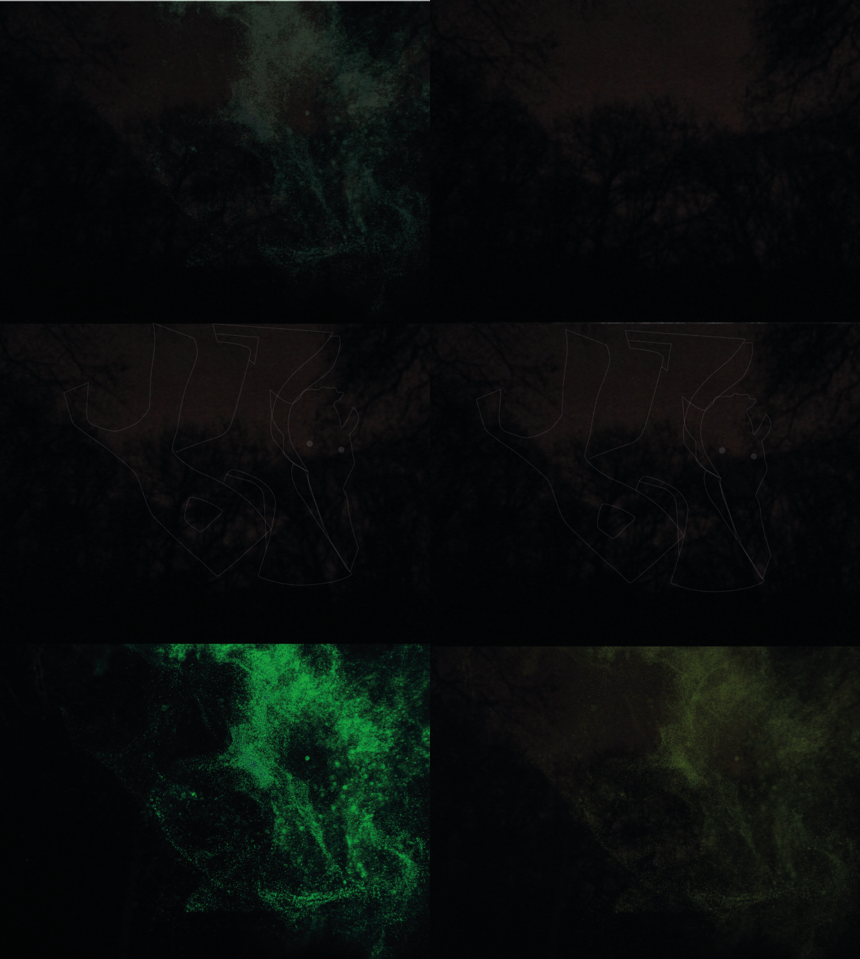 Dám sem ještě stejnou kompilaci fotek z prvního snímku, i zde lze s trochou fantazie rozeznat, že linie světelného objektu kopírují linie různě tmavých ploch na pozadí, které osvítil blesk: