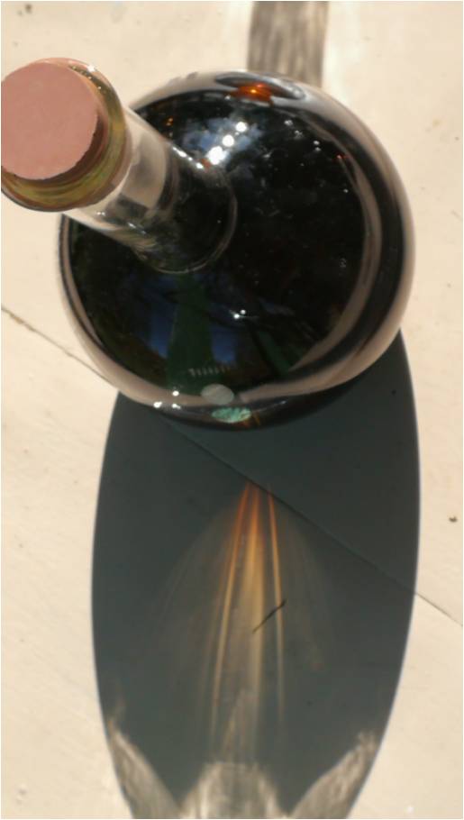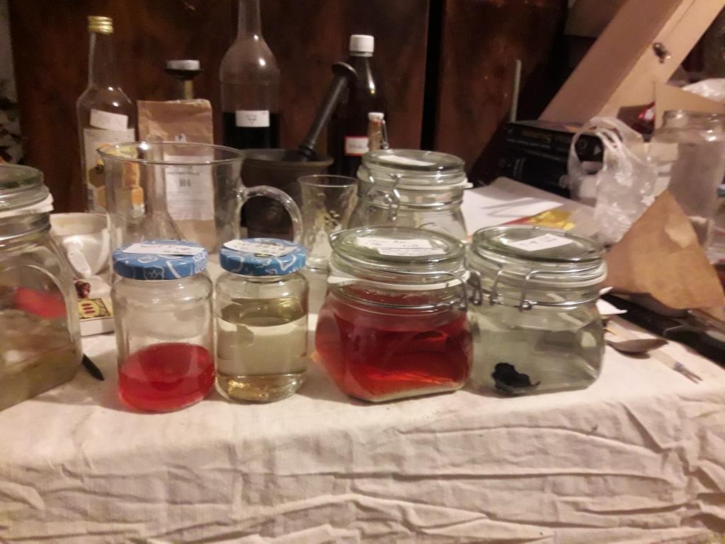 zleva (ty predni ctyri flasky) - budouci tinktura z cerveneho koralu, volatilnejsi frakce siry extrahovane z antimonu rozpustena v rektifikovanem duchu vina s kouskem zlata, dobre pokracujici extrakce siry ze skla antimonu, rozpousteni kusu olova pro prvni experimenty na ceste octanu. ani jedno z toho vlastne neni cista alchymie, ale spis spagyrie (na krizovatce, kde se to deli, stoji cedule s napisem "Tajny ohen"), nicmene antimonovy Lapis Ignis a kameny vyrobene octanovou cestou jsou v dnesni dobe nekterymi kolegy vnimany jako zpusob jak vyrobit Velke Dilo. tento nazor ani u jedne z techto cest nepovazuju za spravny, nicmene myslim, ze neni od veci to vyrobit, minimalne jako dukazni material pro svoje uvahy do nasledujicich let.