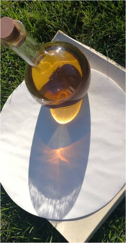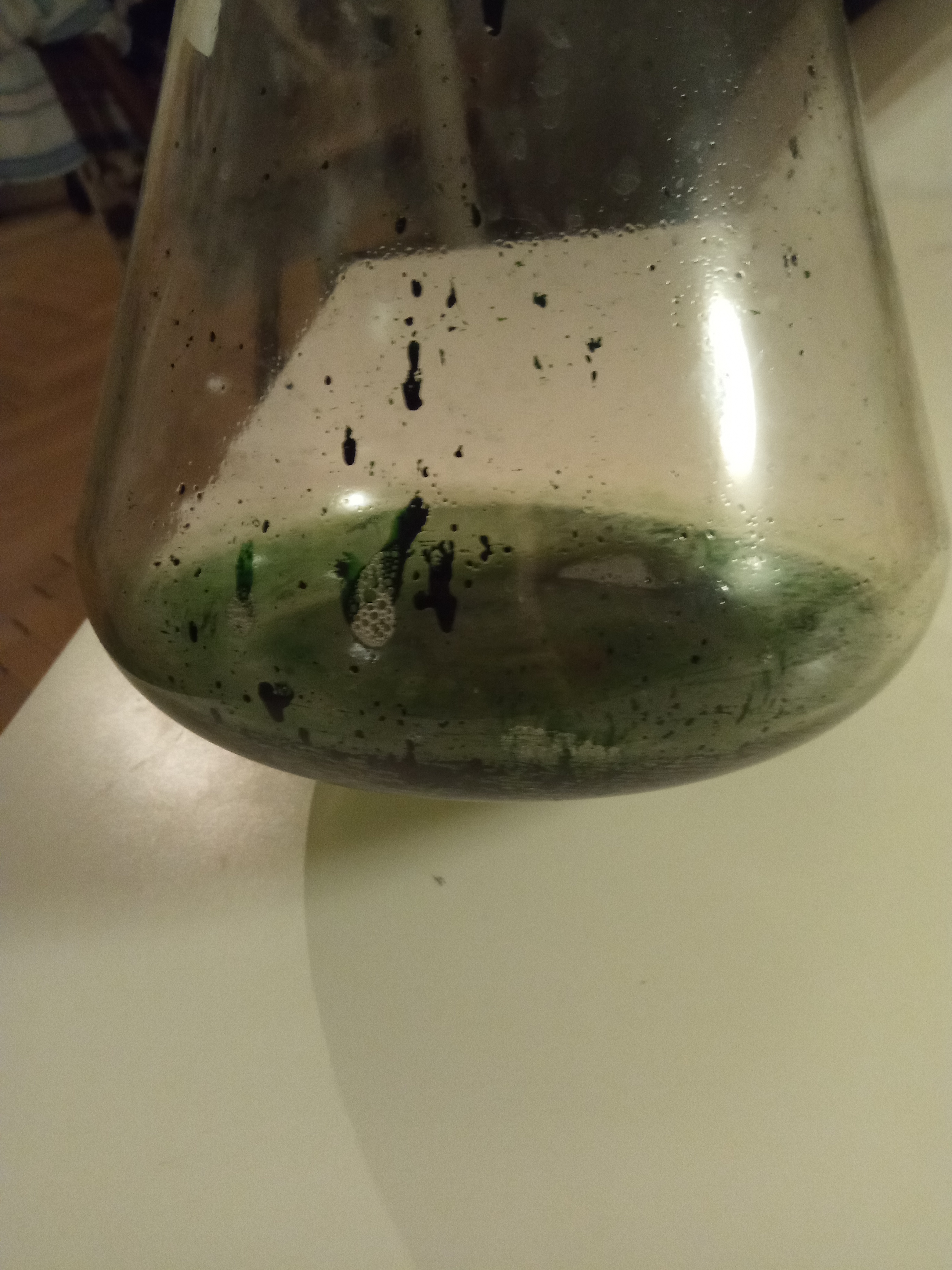 Potřeboval bych poradit a rád bych slyšel váš názor nebo praktické rady týkající se výroby esence. Když dám tinkturu do aparatury, destiluji, tak mi po první destilaci zbude na dně olejnatá zelená vrstva, která se sakra blbě umývá (viz obrázek). Obzvlášť ve velké úzkohrdlé erlence, kam se blbě dostává. Všechnu tu silně zbarvenou tekutinu jsem slil jako zdroj síry, ale prostě část se usadila na dně a teď stojím před volbou, jak a jestli ji z tama dostat.