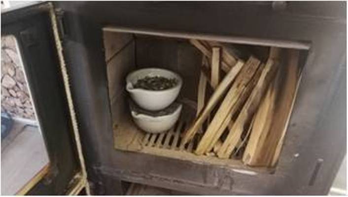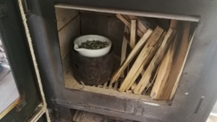 Pomůcky: prosklená krbová kamna a „železný rytíř“ – dvě silnostěnné třecí misky, kus silnostěnné trubky odpovídajícího průměru s vyvrtaným otvorem pro odvádění vlhkosti a dvě nerezové misky - malou jako příklop misek třecích a větší po obvodu nastříhanou jako příklop vnější trubky -„ přilba brnění“ Pro větší množství byliny lze misky přiklopit na sebe nebo pro dvě byliny postavit na sebe.